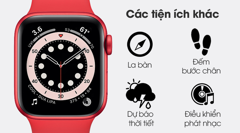 Apple Watch series 6 sở hữu nhiều tiện ích khác như tìm điện thoại, hướng dẫn lộ trình, đếm số bước chân, dự báo thời tiết, định vị, nghe nhạc trên đồng hồ, tính lượng calories tiêu thụ, ... mang đến cho bạn một cuộc sống thoải mái, hiện đại.