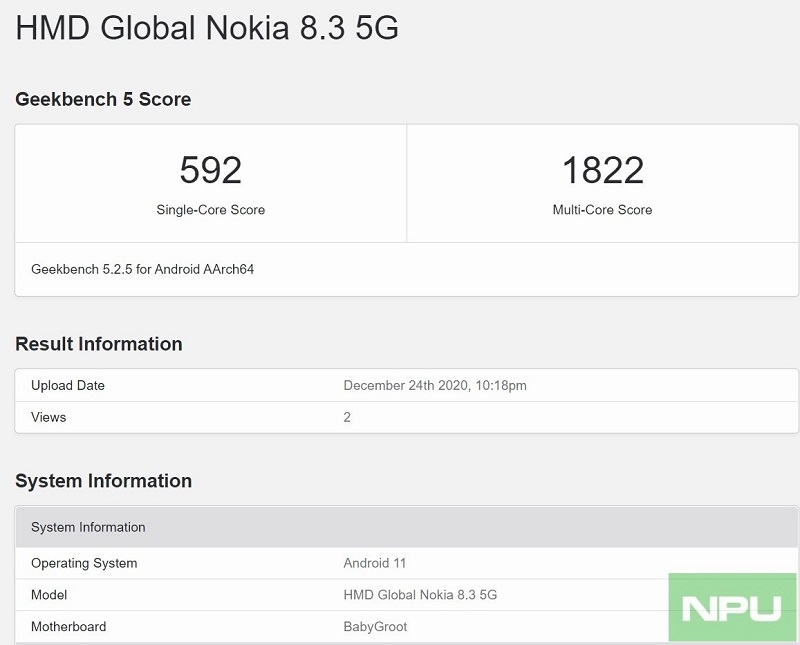 Bây giờ, một thông tin đáng mừng là Nokia 8.3 5G đi kèm Android 11 đã xuất hiện trên Geekbench. Theo đó, Nokia 8.3 5G chạy Android 11 đạt 592 điểm trong bài kiểm tra hiệu năng đơn lõi và 1,822 điểm trong bài kiểm tra đa lõi. Đây là minh chứng cho thấy Nokia 8.3 5G đang được thử nghiệm trên nền tảng Android 11 và việc cập nhật có thể đến bất cứ lúc nào trong thời gian tới.